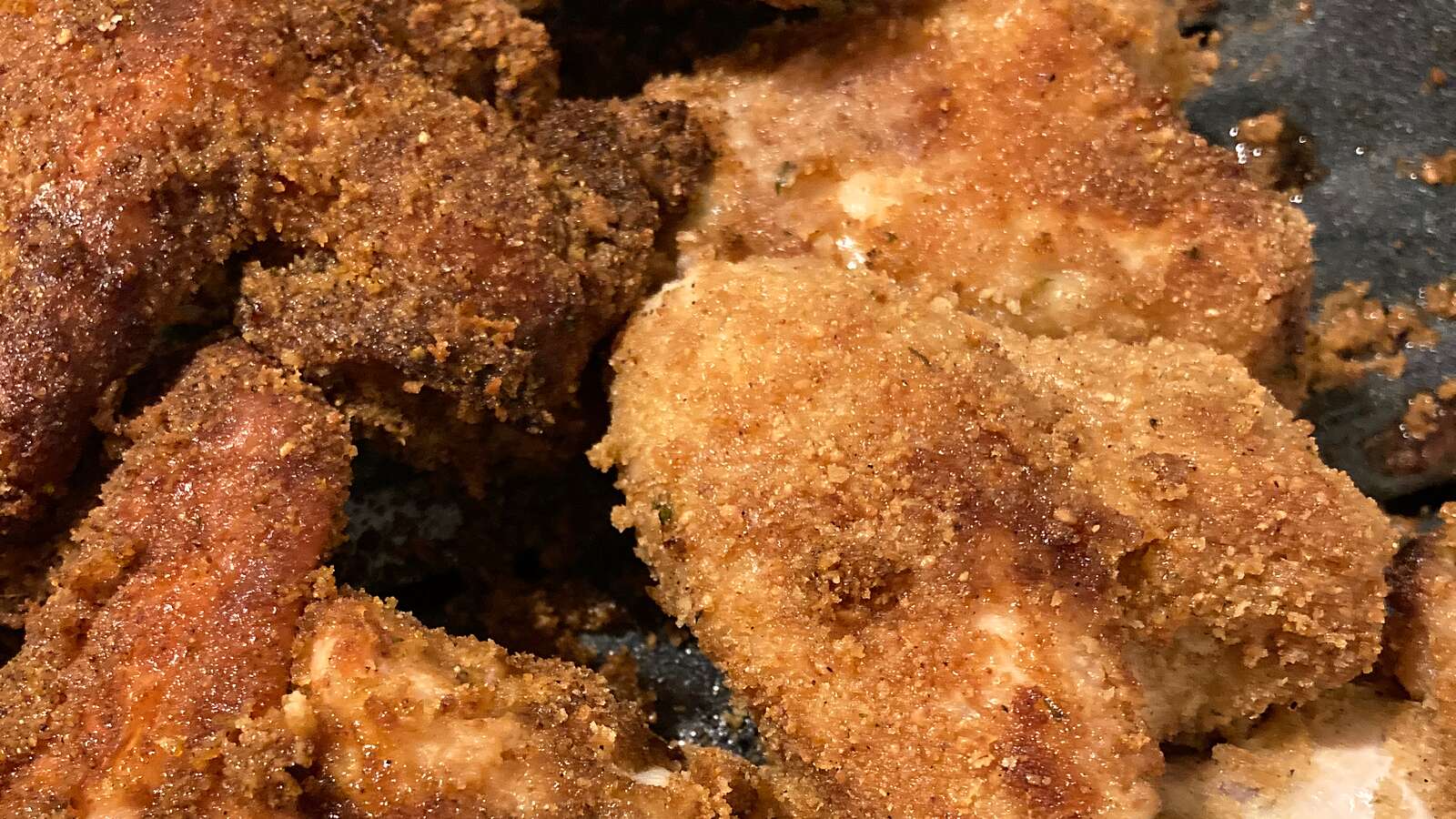 Delicious oven-fried chicken wings. All you need to make them are chicken wings, bread crumbs, Parmesan cheese, garlic powder, melted butter, and a cookie sheet.